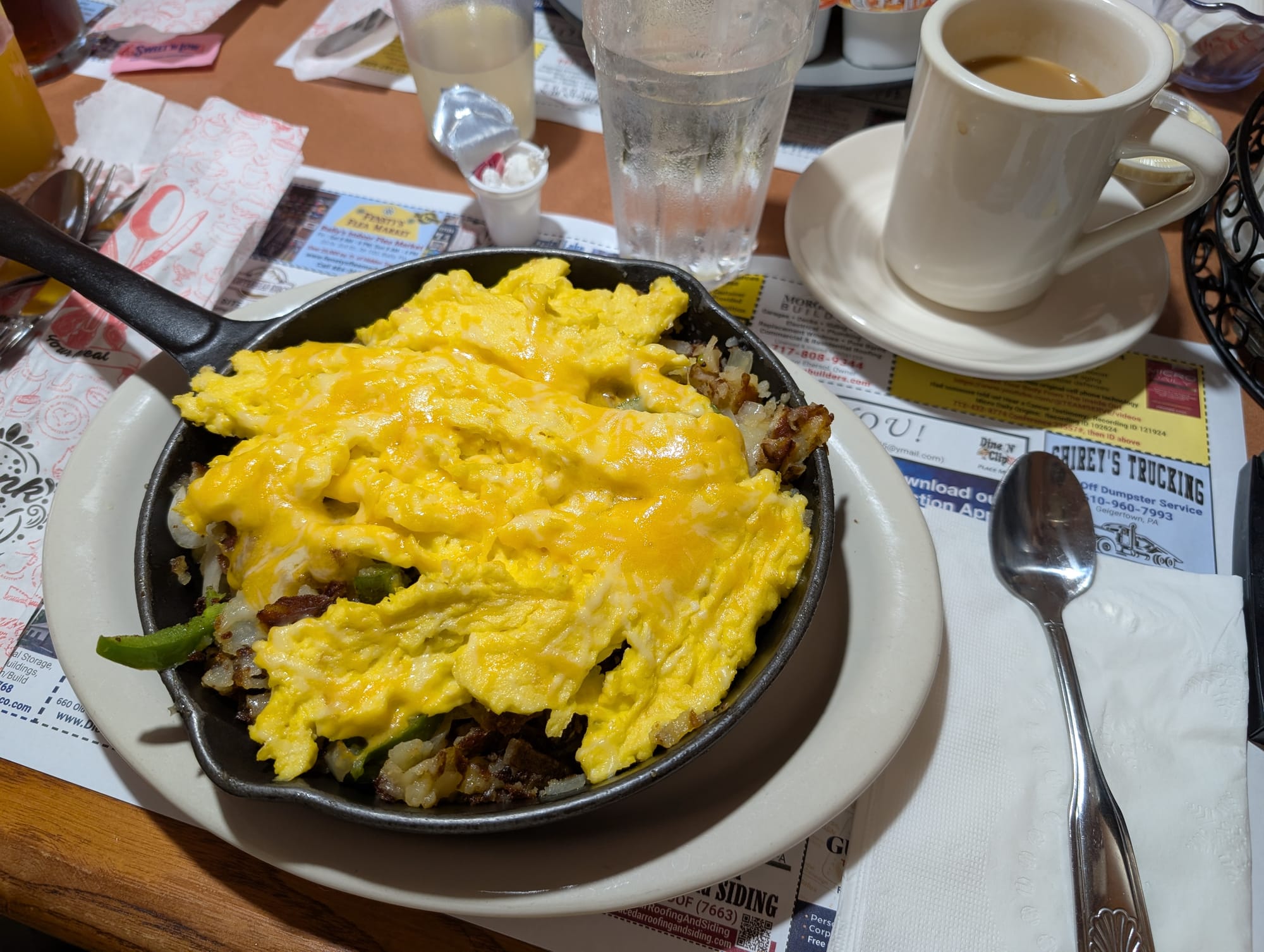 I ordered a farmer scramble because there was not a breakfast wrap on the menu. The description on the menu says it consists of potato, onion, green pepper, cheese and sausage. It does not mention any eggs, leading me to ask the waitress if it comes with an egg. The lack of confidence in her response of “I think so but I’m not sure” was reassuring. Spoiler alert, it did come with egg, but I did not know until it came out to the table. I wish I would have ordered the egg over easy because it came out as a very hard scrambled egg (which was overcooked, dry, and lacked flavor). Overall the skillet part itself was good. The potatoes were nice and oily, with crunchy veggies and tasty sausage. It definitely needed some salt and ketchup, but I feel like at this point, it is a standard addition.