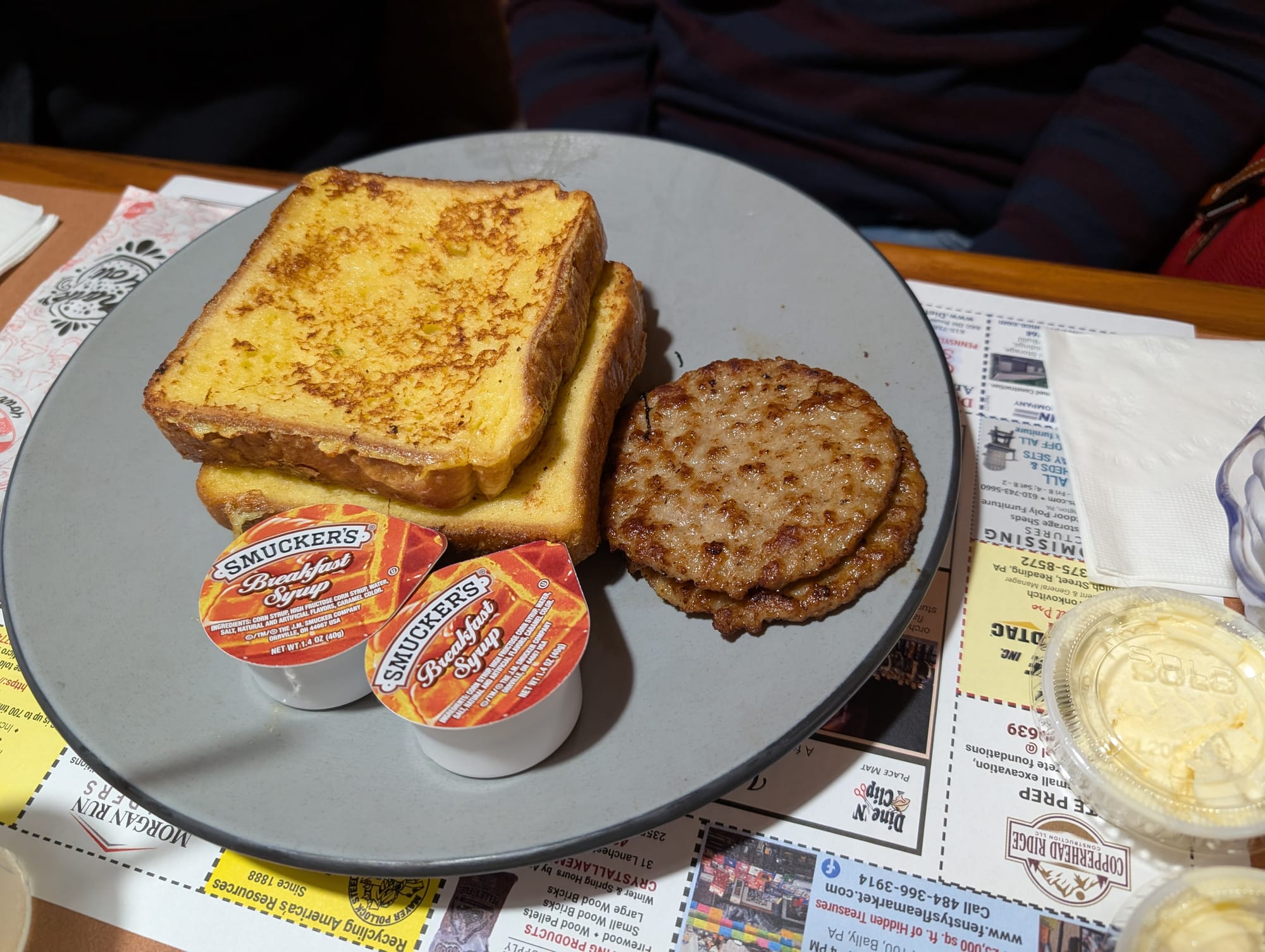 Our breakfast journey began in a very tiny booth. Maybe it was tiny because Ben and I are large people, or maybe we are too used to sitting across from one another (thanks Muffin but Trouble). Or maybe the booths are just small. The waitress was brand new, like first day on the job new. She was very sweet but extremely awkward and could not answer basic questions about the menu.