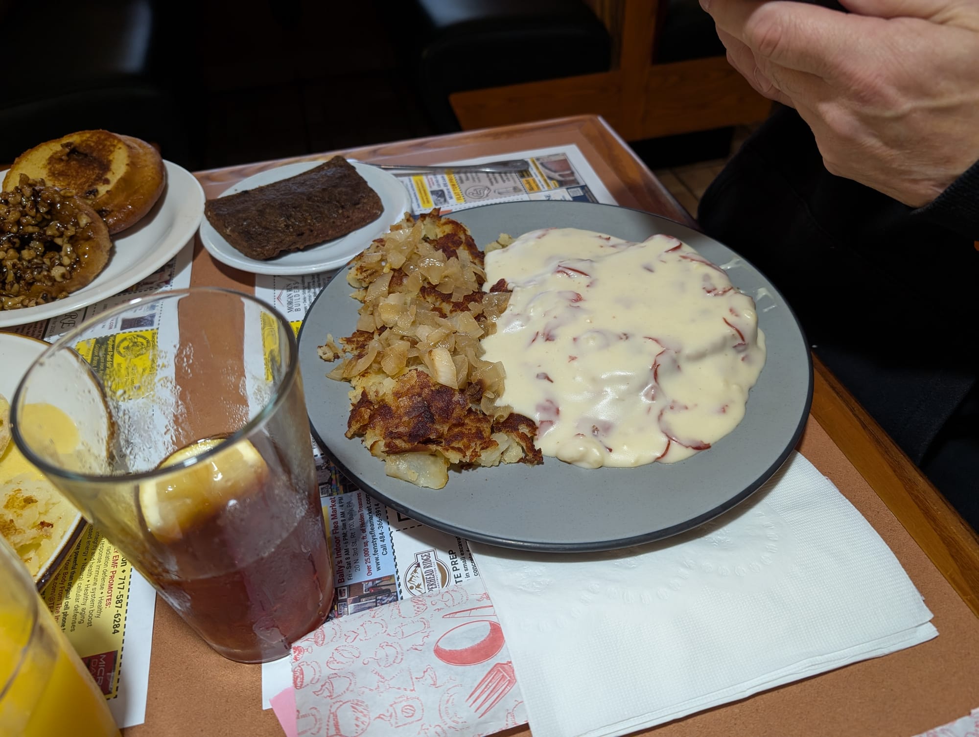 The iced tea, while appropriately chilled, could have benefited from a fresher taste. The scrapple, on the other hand, was a highlight—seasoned and cooked just the way I like it: soft on the inside with a crispy exterior. Unfortunately, the cream dried beef, which is my go-to breakfast choice, fell short. It was pasty, flavorless, and not nearly as enjoyable as I’ve experienced in other establishments. The hash browns, though decent, were unremarkable and certainly didn’t stand out.