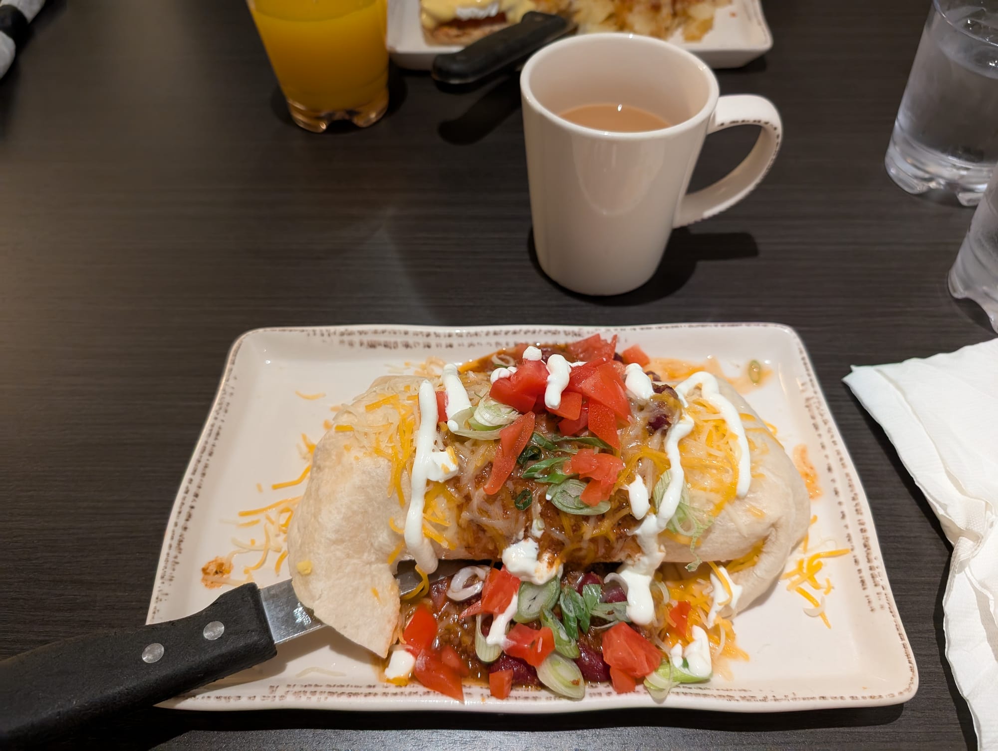 I ordered the OMG burrito, with the actual burrito containing egg, sausage, and home fries, topped with chili con carne (meat chili), a drizzle of sour cream, and fresh diced tomatoes and green onions. Honestly, it was incredible. In my opinion, the egg was super fluffy on the inside. The potatoes were delicious and well seasoned. The only thing I didn't love was the sausage had a very strong fennel flavor in it, which took away from some of the other flavors in the burrito. I really enjoyed the chili con carne on top. It's like one of their classic things on the menu that you can get on potatoes and other stuff too. It is on the sweeter side, so Ben didn't really love it because he felt like it took away from other flavors, but I really enjoyed it. It just depends on whether or not you like a sweet chili. I also appreciated the tomatoes and green onions. It really helped to have a little bit of freshness because the rest of the dish was super heavy. My only other complaint is that the plate that they served it on was a little too small. I needed to manhandle this giant burrito with a steak knife and fork so I wished they would have put it on a bigger plate. Truly one of the best breakfast burritos I have ever had.