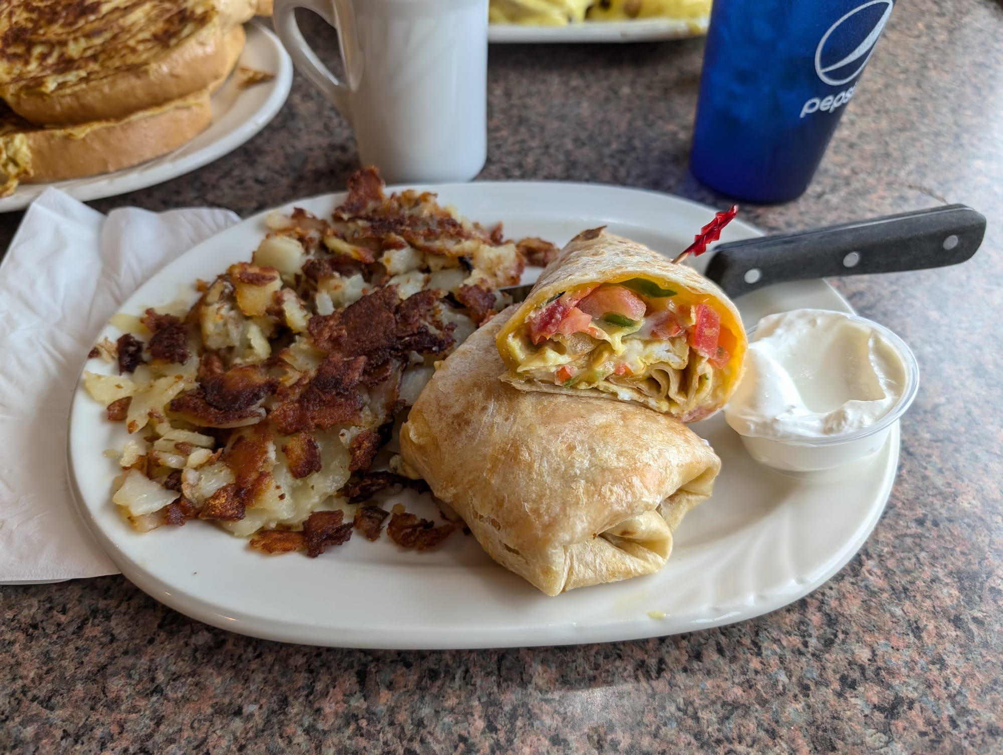 Chris's has some of the best diner coffee that I have had to date. However, their water is chlorinated and they hand out paper straws which is sad. I have now had their breakfast burrito multiple times, and it still reigns supreme as one of my favorite breakfast wraps available. It comes with sausage in it, but the first time I ordered it the sausage tasted off. From then on, I ask for it without sausage, and the lack of meat does not take away from the deliciousness of the wrap with the egg, cheese, and vegetables inside. Chris's breakfast potatoes are also delicious. I like to get them well done but honestly they're crispy enough without asking. I just prefer if they have a little bit more salt on them because without it they are a bit bland.