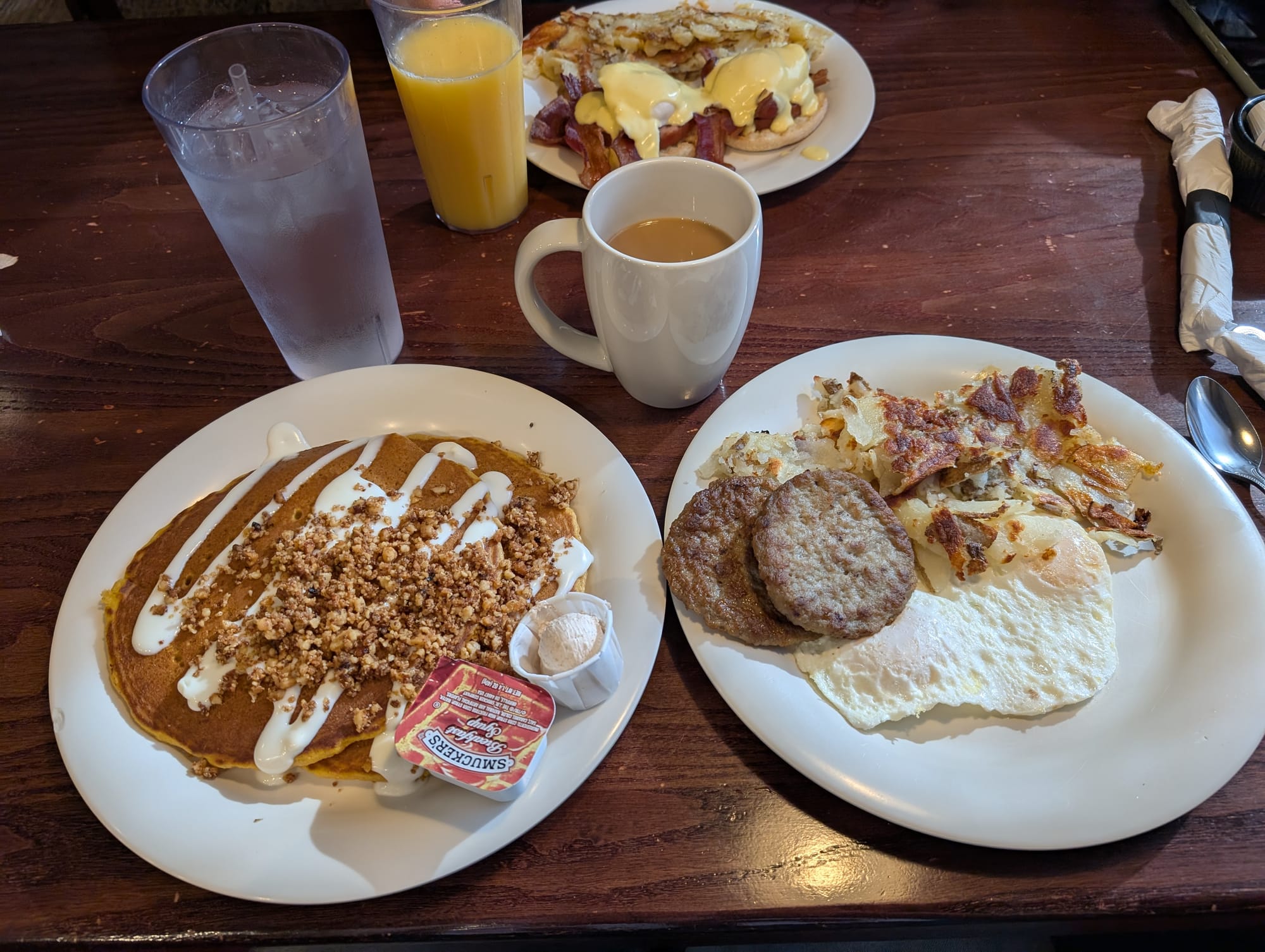Again, another diner asked if I wanted a small or regular OJ. Maybe I'm looking petite in my old age. Of course I got a large. I decided on getting a little fancy and getting the double bacon (with Canadian and regular bacon) benedict. It was honestly really solid. The Canadian bacon was very thick which had me a little nervous that it was going to be too much or chewy, but it wasn't. Along with the pretty crispy bacon, it was very pleasant. The egg was maybe a tad over done. The hollandaise was quite excellent and it tied it together very nicely.