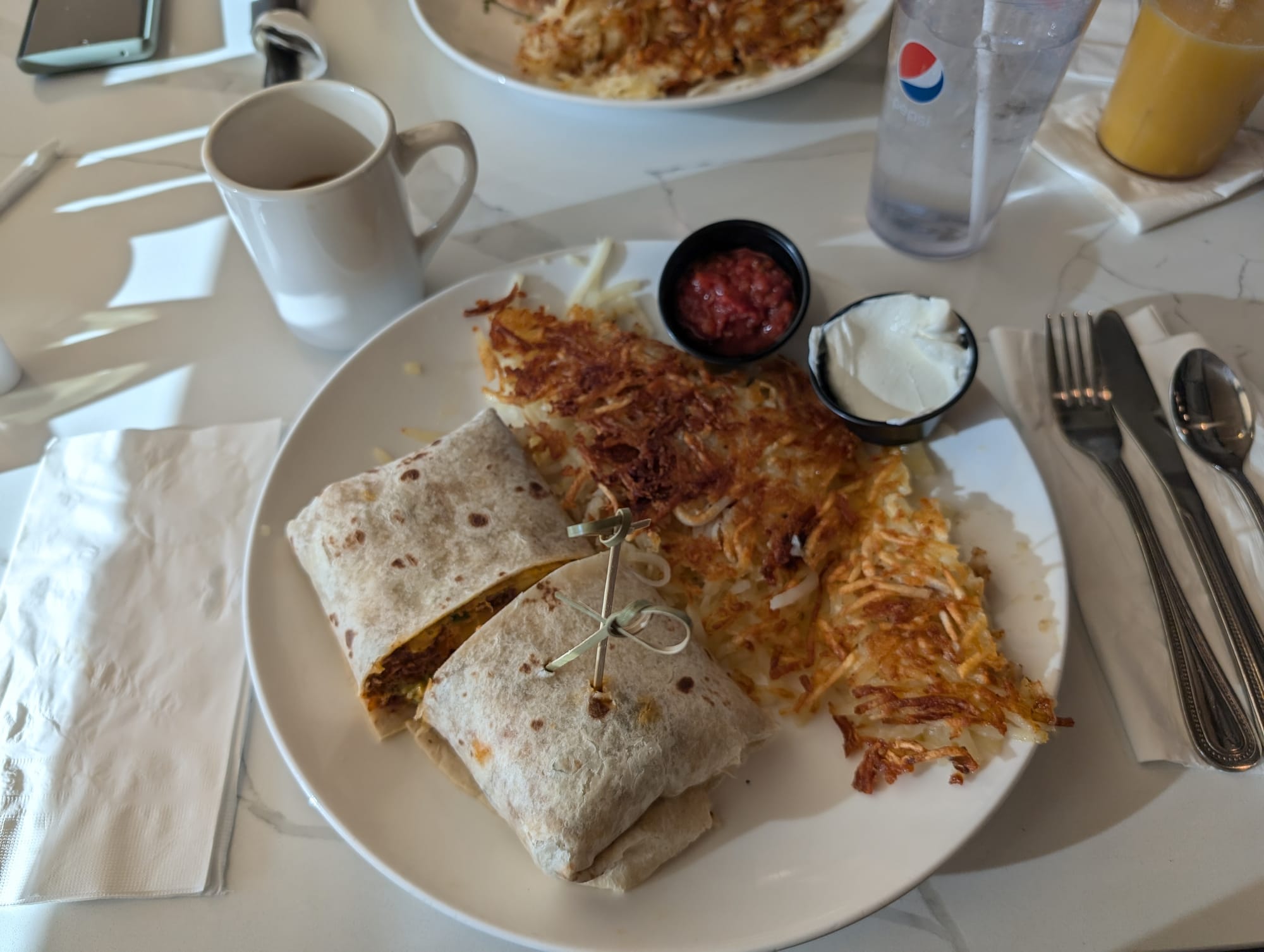 I ordered my classic drinks of water and decaf coffee. Both were not good. The water was chlorinated and the coffee was just not a good cup of coffee. Like in Elf when Buddy takes Jovie to the “world’s best coffee” and she is super disappointed in the coffee…that is how I felt. I ordered their chorizo burrito made with spicy chorizo, eggs, cheese, avocado, onions, and peppers. Overall, not bad for a diner breakfast burrito. The chorizo was not spicy at all, like literally no spice at all, and there was almost too much of it in the burrito (like it took over all the other flavors). I liked the peppers and onions (not cooked super hard which is what I like) and there was tons of cheese in it which was good. It came with salsa and sour cream. The salsa was sweet (not a fan) but the sour cream was a nice addition. The hash browns were pretty good. They had a nice crust on top and were oily underneath. With some salt and ketchup I enjoyed them.