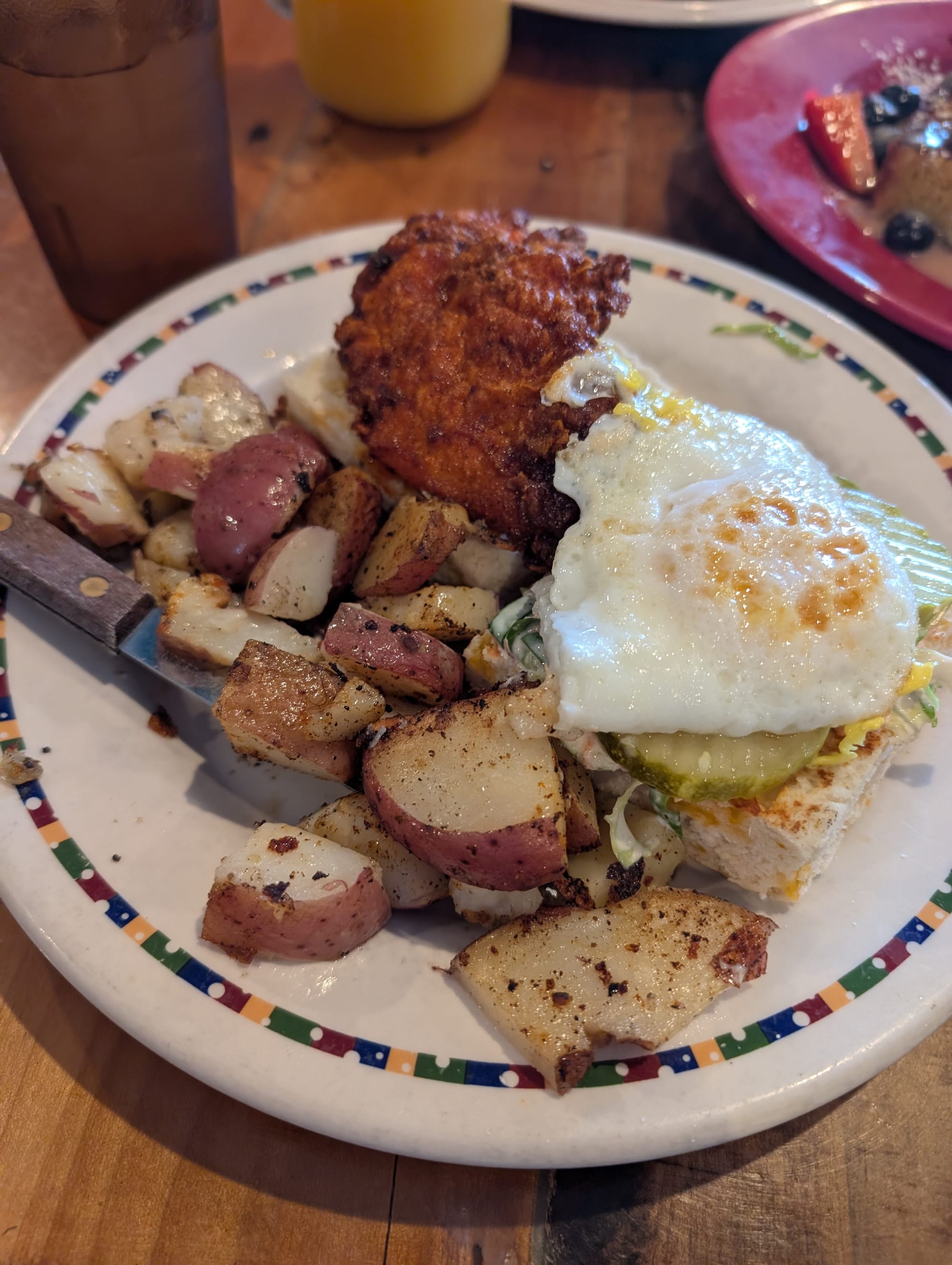 The decaf coffee was fine, just an average cup of coffee. The mug I got was so big I actually needed an additional sugar and cup of creamer in it. The water was good and not chlorinated. With no breakfast wrap in sight, I ended up ordering one of their specials called the Nashville Chicky Biscuit. It was a piece of fried chicken dipped in Nashville hot sauce on a biscuit with an egg, dill pickles, and coleslaw served with a side of home fries. If you take a look at the picture, you can see it came out in two separate halves, almost like when you get a real big burger at a restaurant. I don’t know if the expectation was for me to eat it like a sandwich, but that was nearly impossible due to the size. I ended up taking off the egg and eating it with the homefries. I then attempted to eat it like a sandwich, but it was a disaster. Part of the reason it was an absolute mess was the lack of structural integrity of the biscuit. It was as dry and crumbly as you can get, and between that and a lack of any flavor, it was a disappointment. The chicken itself was fine. It definitely was not “Nashville” hot because there was barely any spice (not a complaint), but the chicken itself was a bit dry. I could barely taste the coleslaw because it was put on that super dry biscuit and all the juice was soaked into it. The dill pickles were very average, nothing special there. The home fries looked really good. They were homestyle, red skin potatoes with a spice blend on them. The first few were really yummy, but then I kept eating them and due to the uneven cut and cook, they were super inconsistent. It was not as good as I wanted it to be.