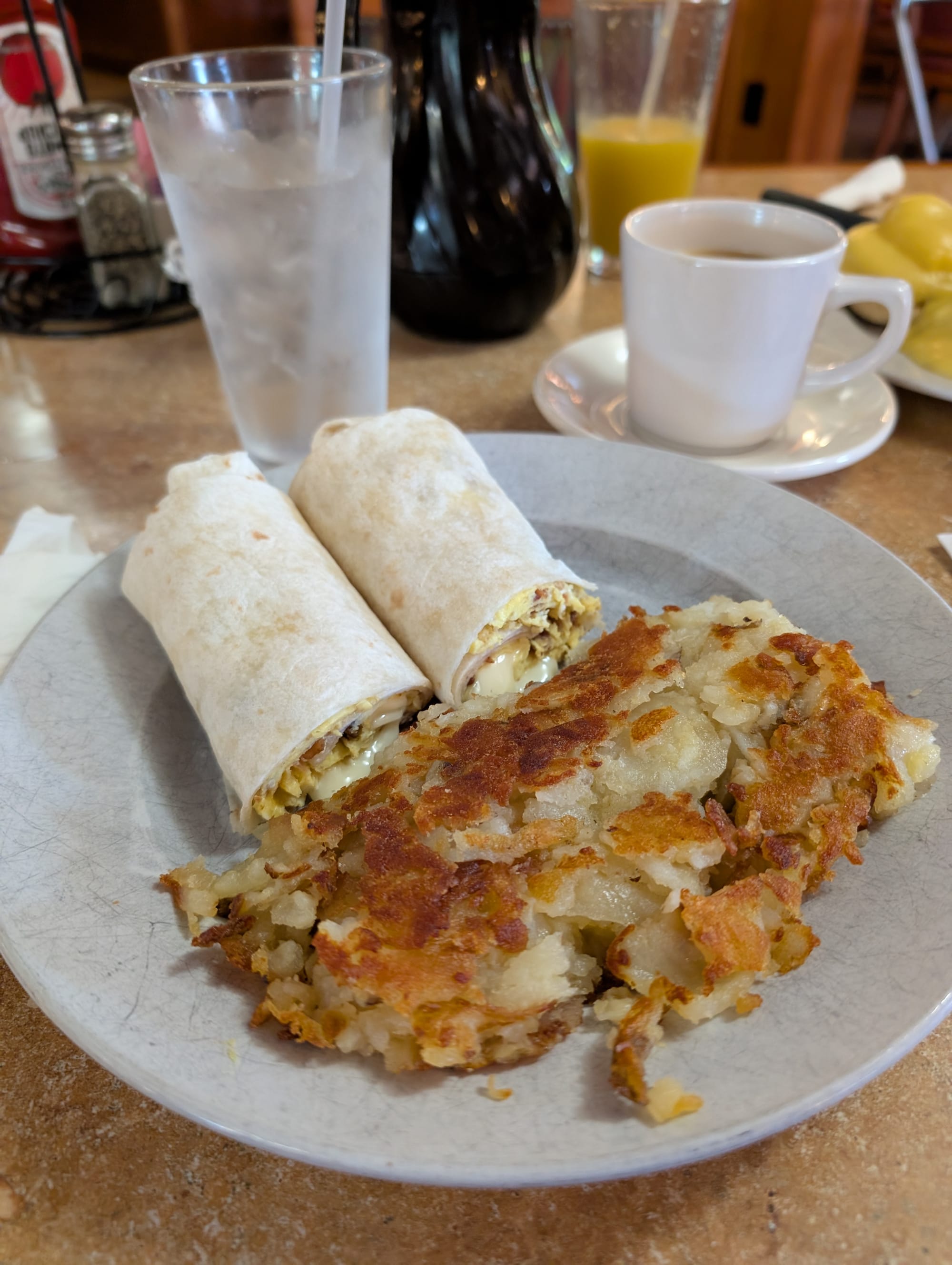 Decaf coffee was ok. It was a solid cup, probably better than your average diner coffee, but not the best I've had. The water was not chlorinated. I got a bacon and egg breakfast wrap with cheese. The waitress warned me that it was small so I got a side of home fries with it which was not included in the price. Looking back, it is a little bit ridiculous that the wrap itself was as expensive as it was without a side. The wrap was fine (and small, just as the waitress said). The wrap felt a little dry and the egg honestly was a little bit dry too. The cheese was good and melty and the bacon was almost like crunchy bacon bits throughout it which was kind of nice. Overall it was not my favorite wrap. The home fries were okay. They had a nice brown crisp on the outside but then the inside was almost mushy like they had definitely been old or sitting on the grill for a while. It definitely needs salt and ketchup. I definitely have had better.