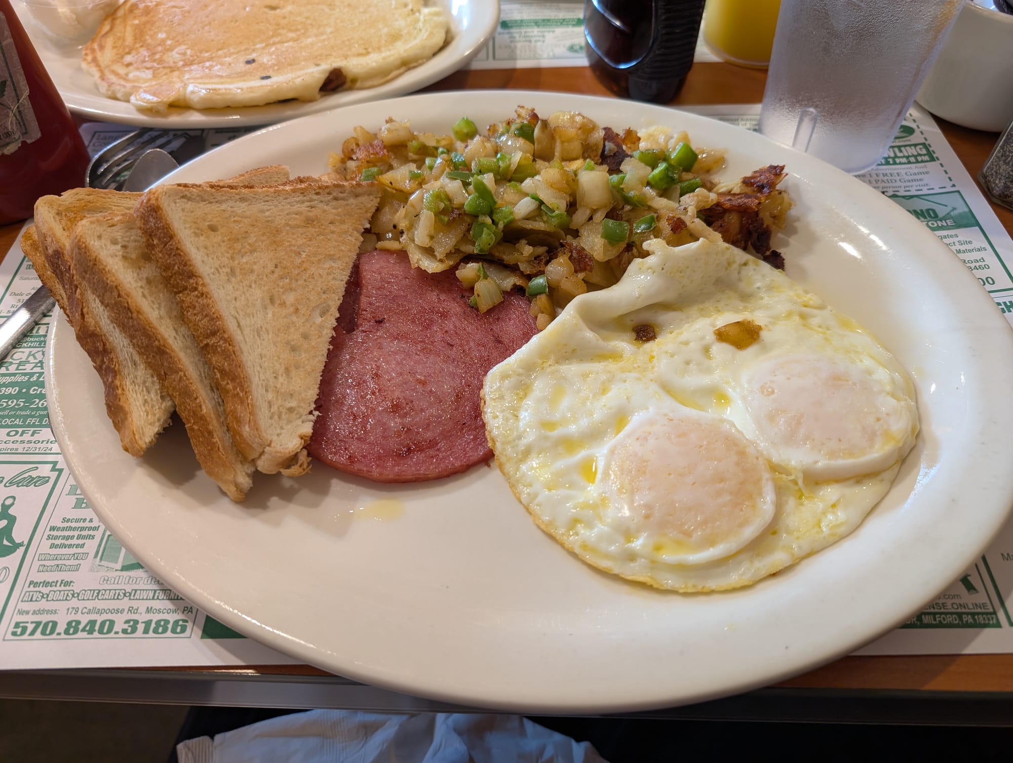 The coffee was good. Not too bad, not the best. I did enjoy the cup of milk instead of creamer. The water was not chlorinated. With no breakfast wrap on the menu, I kept it simple with two eggs over medium, white toast, pork roll, and home fries. The waitress immediately asks if you want peppers and onions on your home fries. How can you say no to that? I can’t, so I got them. I have to say that it was one of the best breakfast plates I've had in a while. The eggs were perfectly cooked. There was no brown on them whatsoever, the egg yolk was super runny, and the white was cooked perfectly. Outstanding, 10 out of 10. The pork roll was very thinly cut. I would have liked a little more crisp or brownness on the outside, but this pork roll tasted different from other pork rolls that I've had. It had a softer, more tender texture and definitely had a more smoky flavor compared to what I am used to, but it was still good. The home fries slapped. The oil or butter that they used had such a good flavor. The peppers and onions were awesome. It definitely needed a little bit of salt and I always like ketchup with it, but man they were good. The toast was just good. Just simple white toast with a good amount of butter got the job done.
