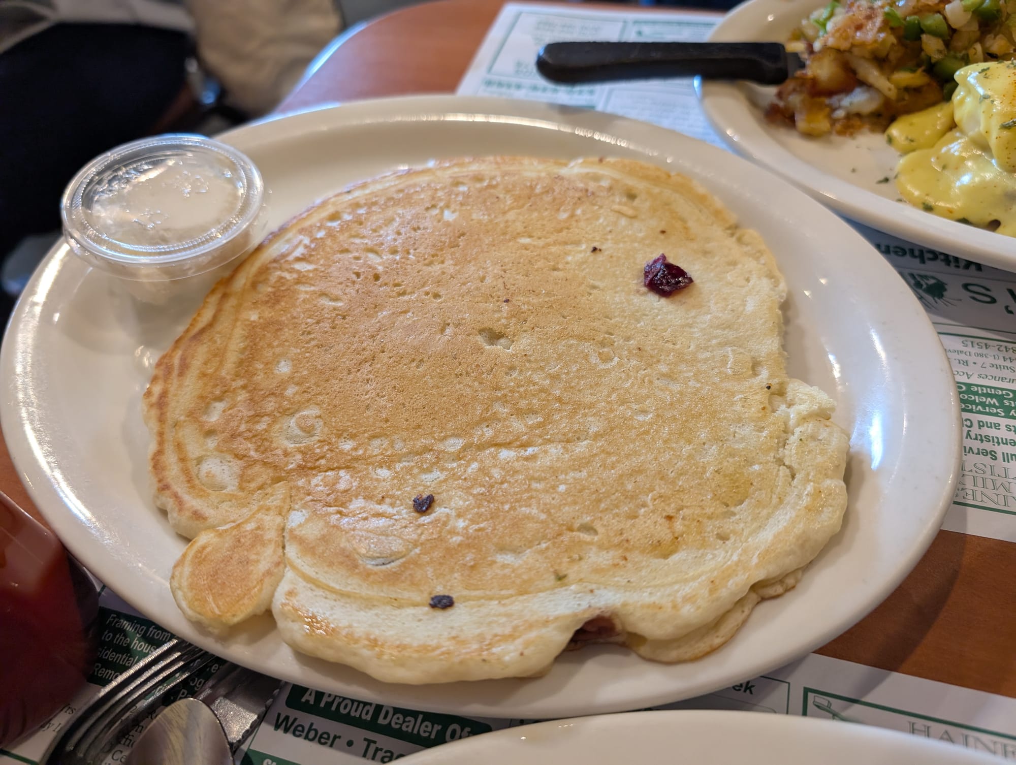 We impulse ordered a pancake after seeing them on the table next to ours. We ordered one with cranberries and pecans in it. We could have lived without the cranberries. Ben recommended putting bananas in there with the pecans and that honestly would have slapped so hard. The pancakes reminded us a lot of the Butter Valley pancakes, especially that they are not cooked super well done. They are lightly cooked, which is Bethany’s favorite style of pancake. They were super buttery, light, and fluffy but they definitely needed the syrup on there for extra sweetness. We wouldn't get the cranberry and pecan fillings again but would definitely get just a plain one next time. Ben could go there and eat a stack of pancakes for breakfast.