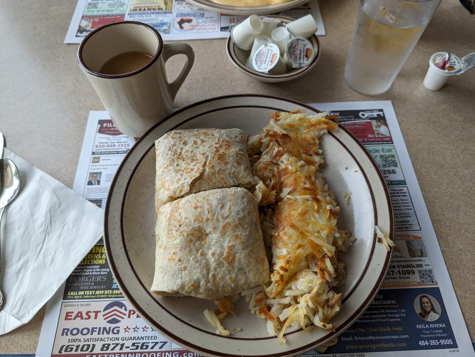 Coffee was mid, which is typical for a diner. Definitely not the worst cup o Joe I’ve had but certainly not the best. Water was not chlorinated but it did taste off, so…do with that information what you will. I got the Trivet wrap (had to because Ben instilled his namesake rule upon me). It had ham, green peppers, onion, cheddar cheese, egg, and potato in it, a meal all in one nice little package. Super duper yummy! It was finished on the grill (thumbs up for that) and it was moist without dripping out everywhere (fellow breakfast wrap enthusiasts will understand that sometimes the water content of toppings will cause the wrap to become soggy, but this was not the case here). Definitely one of the best breakfast wraps I've ever had. The side of hash browns was not great. They were essentially unseasoned and uncrispy shredded potatoes. Needed lots of salt and more time on the grill (do not let the color of them in the picture deceive you, they were not crispy).