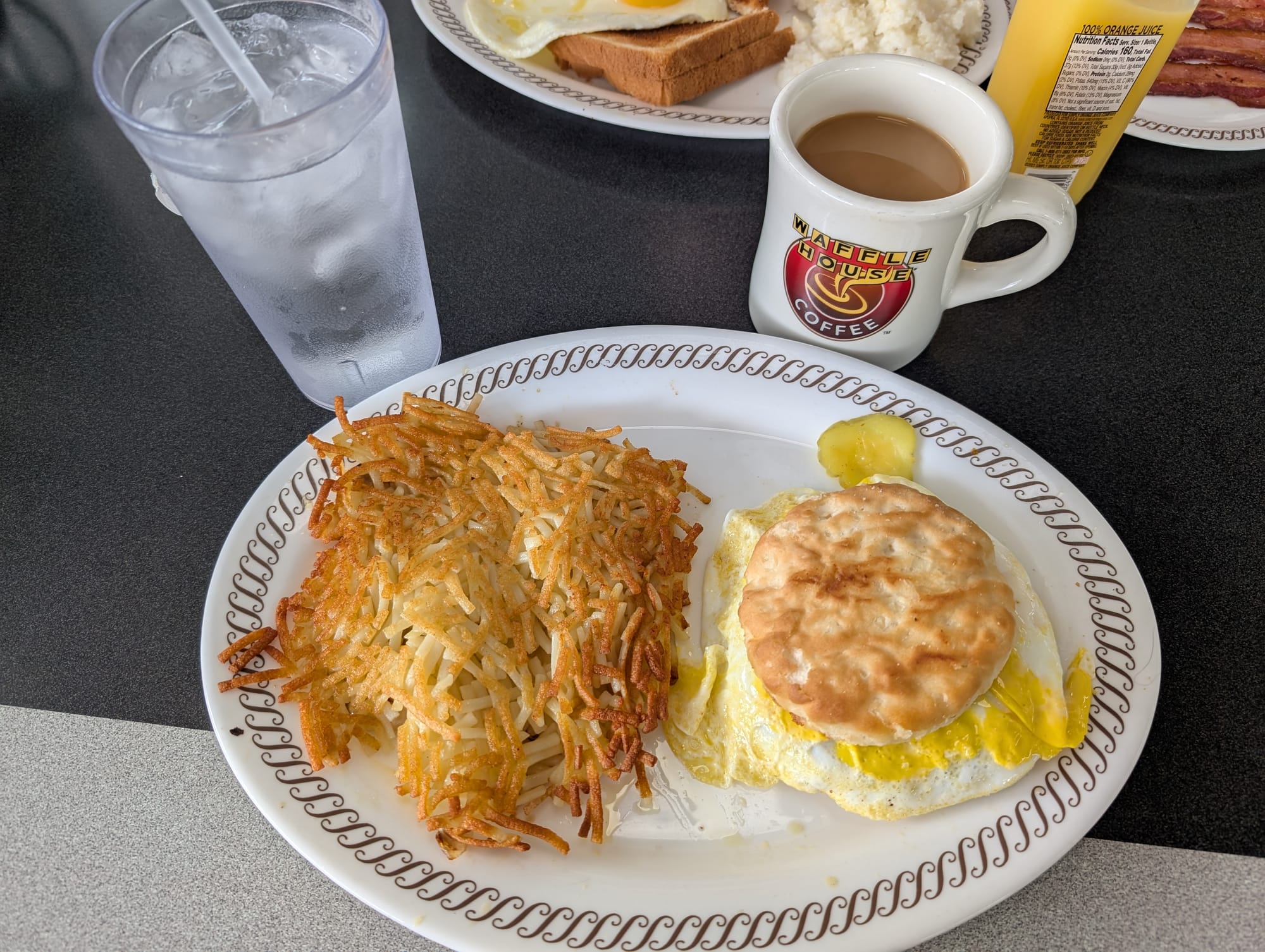 My decaf was fine, just a normal diner coffee. The water was not chlorinated. I got a sausage, egg, and cheese on a biscuit with a side of hash browns “smothered”, meaning with grilled onions. When my food was brought out, the waitress had me check to make sure the onions were actually there, hidden beneath the hash brown. That has never happened to me before, but I guess I appreciate her wanting me to have my onions. For those unfamiliar with Waffle House hash browns, they are essentially small potato noodles. They are super crisp on top, but the rest are limp and sad. They taste fine, but definitely need salt and ketchup. Same with the breakfast sandwich. I have had more flavorful sandwiches from Wawa. Like I don’t know, everything just lacked flavor. Literally any flavor. The absolute lack of salt was appalling. With my sandwich I got one quarter size, thin pickle disc on my plate, and it was a good little dill pickle. That was probably the most flavorful thing on my plate if I’m being honest.