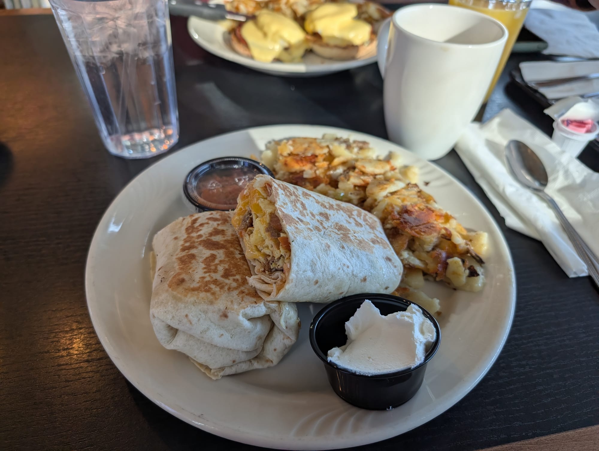 I got my decaf and water. The water was chlorinated so that was kind of disappointing and the coffee was fine. It wasn't bad but it wasn't good either. I had no real complaints and drank most of the cup. I got a “special” breakfast burrito. They do have a regular one on the menu but the special one had chorizo and jalapenos in it so I went that route. I need to stop gaslighting myself into thinking that I really like jalapeno in my breakfast wraps because I want it every single time, but then it's always too much and too spicy for me. So that's a “me" problem, not a problem with the actual food. The wrap had chorizo, eggs, cheddar cheese, onion, tomatoes and pickled jalapenos in it and it came with sour cream and salsa on the side. I was really impressed with the burrito. Not only did all of the ingredients have a good balance, like there weren't too many eggs, there wasn't too much cheese, and the veggies were just right. There was too much jalapeno for me, but that's again my problem. They also toasted it on the flat top which in my opinion just takes it to the next level. The salsa definitely felt homemade by itself. There was a lot of cilantro in it when you ate it alone, but when you ate it as a bite with the rest of the wrap, it was excellent. The sour cream was great as well, nice and thick. The home fries were outstanding. Probably some of my favorite home fries to date. I don't know what it was about them, but they had the right amount of oil and butter on it. They had some crispy bits throughout, not just on top. And even the bits that weren't crispy still tasted really good. I didn't need to add any additional salt and in my opinion home fries always taste better with a little bit of ketchup, but it was an excellent breakfast for me.